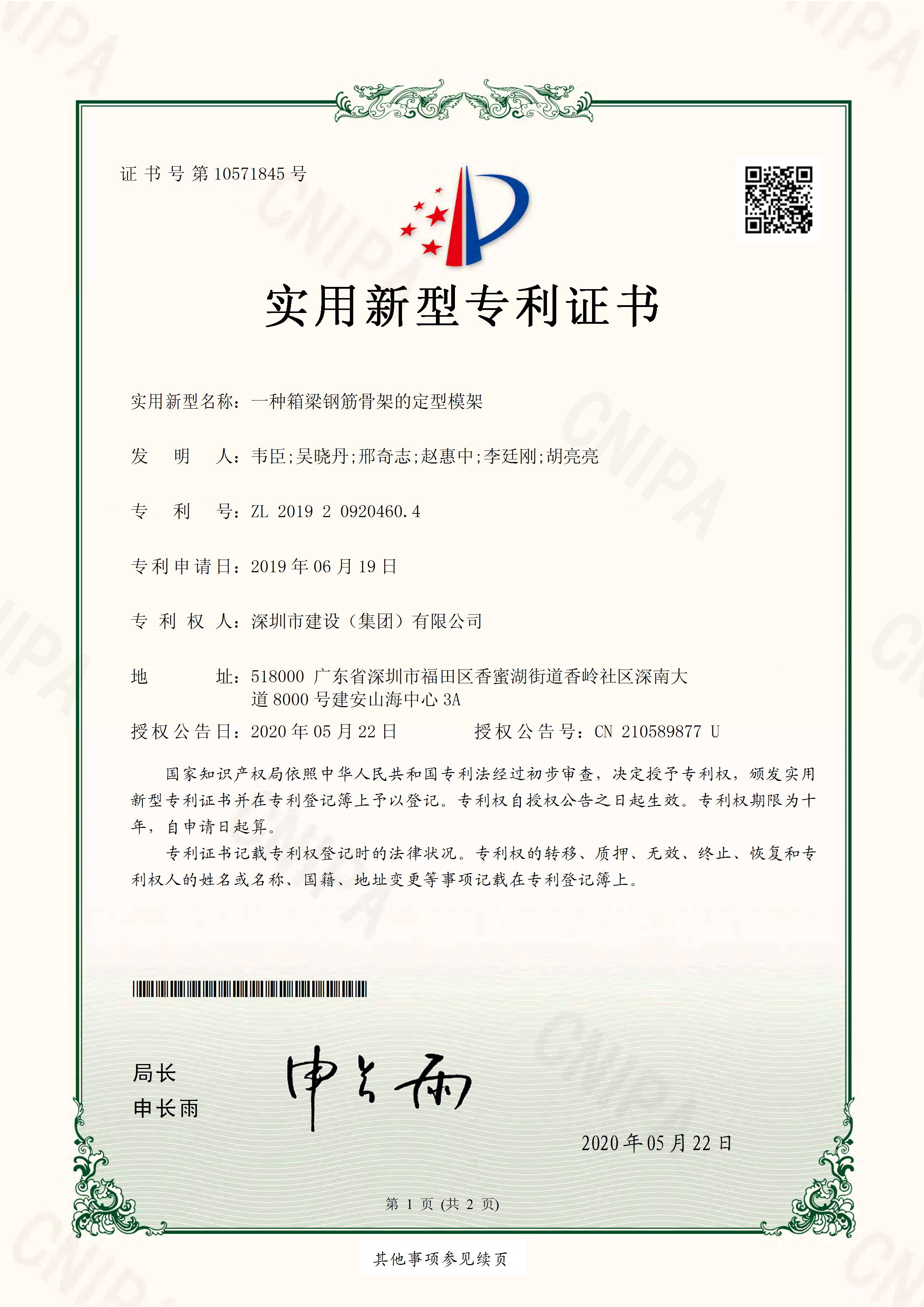 近日,深圳建設(shè)集團(tuán)收到國(guó)家知識(shí)產(chǎn)權(quán)局頒發(fā)的“一種箱梁鋼筋骨架的定型模架”實(shí)用新型專利證書(shū),這是公司回歸國(guó)有序列后獲得的第7項(xiàng)國(guó)家級(jí)專利。        一種箱梁鋼筋骨架的定型模架,旨在克服現(xiàn)有技術(shù)中箱梁預(yù)制臺(tái)座...